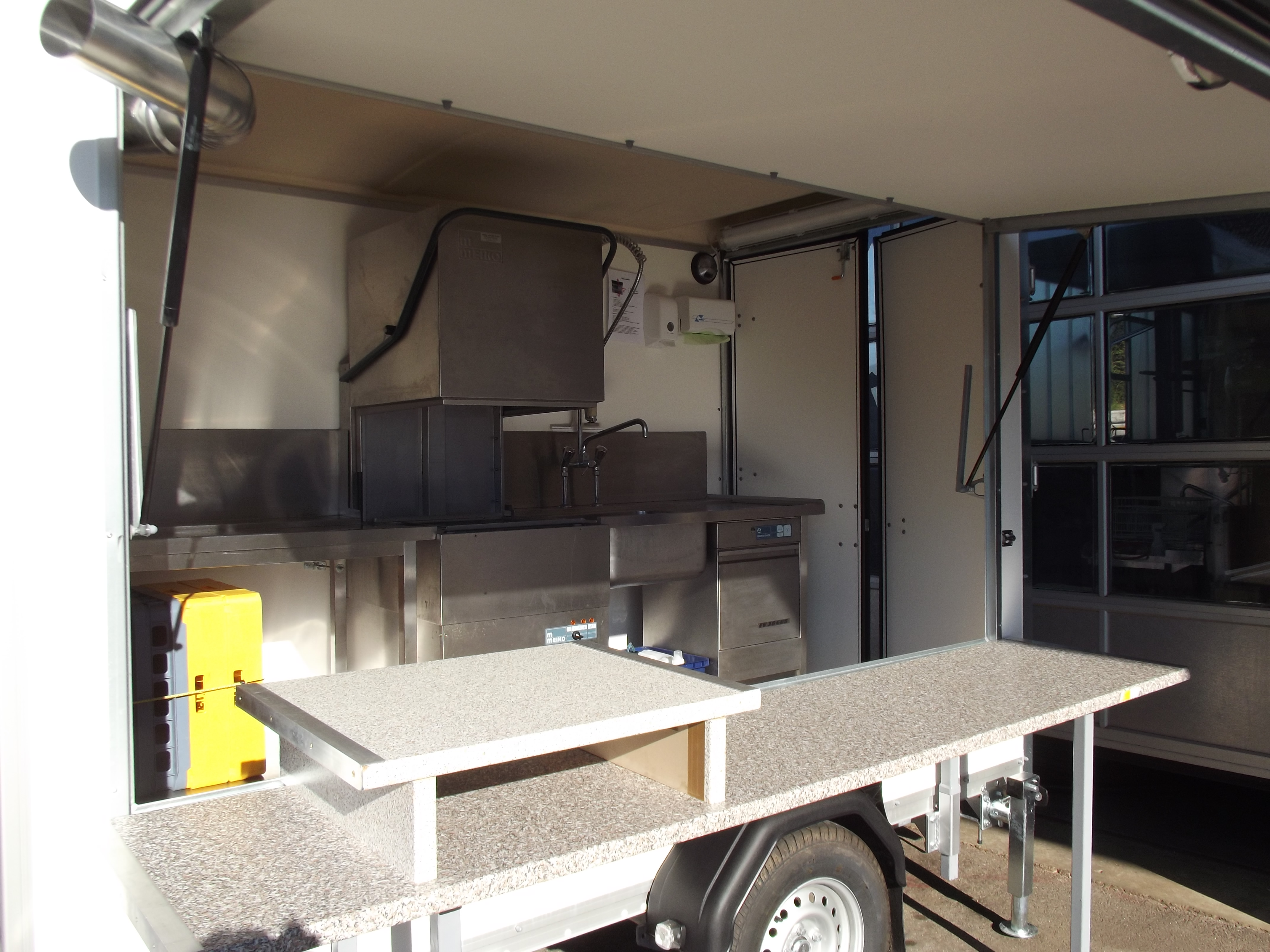Geschirrspülmobil 1. Einachs Anhänger mit Durchschubspülmaschine, Gläserspüler, Vorspülbecken, Warmwasserboiler, Ablageflächen und großer Annahmetheke, Korbgröße 500 x 500 mm und 380 x 380 mm. 3/4” Wasseranschluss und 32A Stromanschluss.
