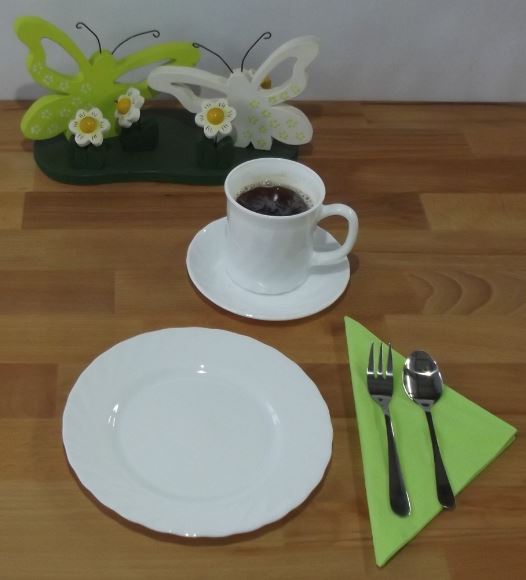 Kaffee-Geschirr besteht aus: Teller, Tasse 0,29l, Unterteller, Gabel und Löffel Kuchenteller Ø 19,5cm, Unterteller Ø 14 cm, uni weiß.