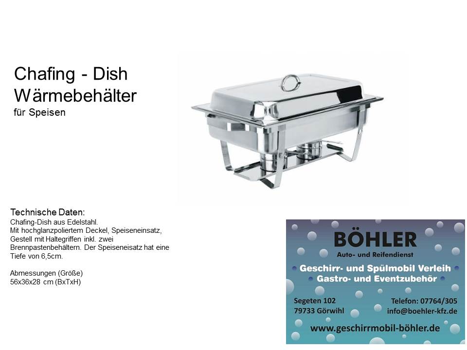 Warmhaltebehälter für Speisen und Soßen: Edelstahl komplett mit verschiedenen GN-Behälter und Sicherheitsthermostat Wärmeregulierung bis max 90° Netzanschluss 230 V / 50Hz Aufnahmeleistung 1200 Watt Abmessungen: 540 x 340 x 250 mm Gewicht: 12,5 kg.